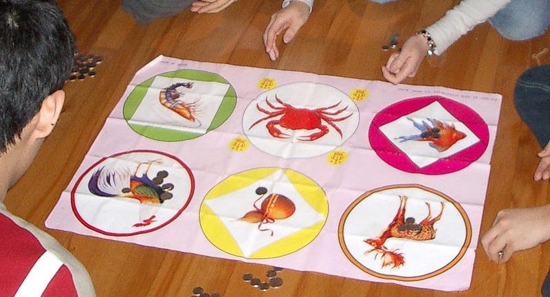 Bầu cua tôm cá is a Vietnamese gambling game that involves using three dice. It is traditionally played during Tết. Image created 2014. Public Domain.